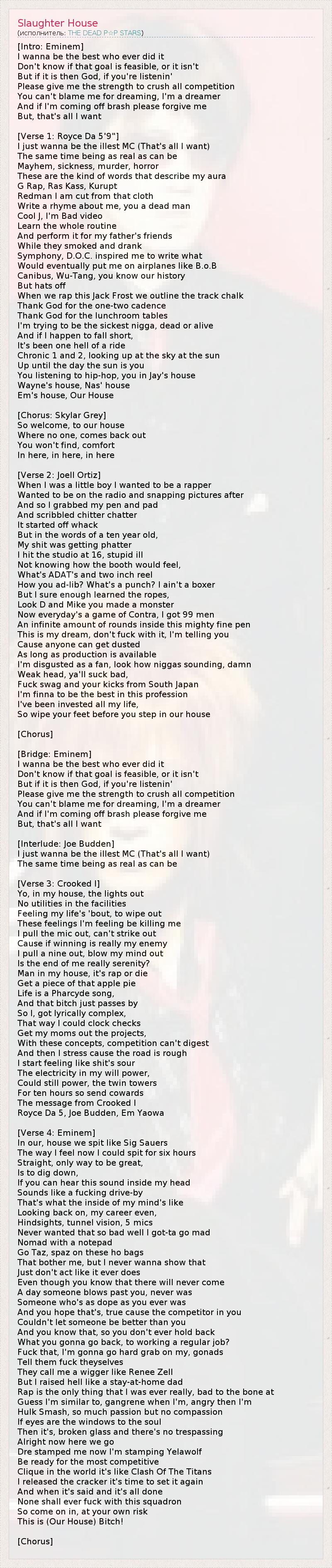[Интро: Eminem] Я хочу стать лучшим из тех, кто делал это, Не знаю, осуществима эта цель или нет. Но если да, тогда, Боже, если ты слышишь, Пожалуйста, дай мне сил подавить всех противников! Ты не можешь винить меня за мечтательность, ведь я мечтатель, А если эта мечта выходит слишком дерзкой, то прости меня, Но это всё, чего я хочу. [Куплет 1: Royce Da 5'9"] Я просто хочу стать самым больным МС 1 (Это всё, чего я хочу) И в то же время быть самим собой насколько возможно. Побои, болезнь, убийство, ужас - Это слова, описывающие мою ауру. G Rap, Ras Kass, Kurupt, Redman - 2 я сделан из этого же теста. Напиши рифму обо мне, и ты - труп. Из клипа "Я плохой" Cool J Я выучил все движения И танцевал перед друзьями моего отца, Пока они курили и бухали. Symphony, 3 D.O.C. вдохновили меня написать то, Что в конечном счёте приведёт меня на самолёт, как B.o.B. 4 Canibus, Wu-Tang, вы знаете нашу историю, Но снимите перед нами шляпу - Когда мы читали "Jack Frost", мы обвели всё мелом. Спасибо, Боже, за движение в ногу, Спасибо, Боже, за обеденные столы. Я пытаюсь быть наикрутейшим ниг*ером, живым или мёртвым, А если я до этого не дотягиваю, Всё равно всё было адски круто. Chronic 1 и 2, 5 ты будешь смотреть на небо, солнце До того дня, пока этим солнцем не станешь ты сам... Ты слушаешь хип-хоп, ты в доме Джея (Jay-Z), Доме Вэйна (Lil Wayne), доме Наса (Nas), Доме Эма (Eminem), ты в нашем доме. [Припев: Skylar Grey] Добро пожаловать в наш дом, Откуда никто не возвращается! Тебе не будет здесь комфортно, Здесь, здесь, здесь. [Куплет 2: Joell Ortiz] Когда я был маленьким, я хотел стать рэпером, Хотел быть на радио, а потом ловить вспышки фотокамер, И поэтому я схватил свою ручку и блокнот И набросал короткий бред, что пришёл мне в голову. Всё началось с фигни, Но, выражаясь словами 10-летнего пацана, Моё дер*мо становилось всё круче. 6 Я попал в студию в 16, тупой, как пробка, Даже не зная, каково это - в студии звукозаписи. Что такое ADAT 7 и двух-дюймовая катушка, 8 Как мои бэки? Что такое панч? 9 Я же не боксёр, Но я уверен, что уже освоил своё дело. Смотрите, D и Mike, вы создали монстра, Теперь каждый день как игра Contra, и у меня там 99 жизней, И бесконечное количество строк выходит из-под пера. Это моя мечта, не трогай её, я тебе говорю, Потому что любой может ходить под кайфом, Пока нар*ота доступна. Как фанату мне противно слушать, как звучат эти ниг*еры, чёрт, Слабый минет, плохо с*сёте, Нахрен ваш свэг и биты из Южной Японии - Я собираюсь стать лучшим в этой профессии. Всю мою жизнь в меня вкладывались, Так что вытри ноги перед тем, как войти в наш дом. [Припев] [Бридж: Eminem] Я хочу стать лучшим из тех, кто делал это, Не знаю, осуществима эта цель или нет. Но если да, тогда, Боже, если ты слышишь, Пожалуйста, дай мне сил подавить всех противников! Ты не можешь винить меня за мечтательность, ведь я мечтатель, А если эта мечта выходит слишком дерзкой, то прости меня, Но это всё, чего я хочу. [Интерлюдия: Joe Budden] Я просто хочу стать самым больным МС*(Это всё, чего я хочу) И в то же время быть самим собой насколько возможно. [Куплет 3: Crooked I] В моём доме нет света, Нет газа и воды, никаких удобств, Такое чувство, что моя жизнь вот-вот разрушится, И это убивает меня. Я вытаскиваю микрофон, не могу облажаться, Ведь если победа - мой враг, То я достану ствол и вышибу себе мозги. Неужели мой конец - безмятежность? Чувак, в моём доме или рэп, или смерть, Отхвати кусочек от этого яблочного пирога. 10 Жизнь - песня Pharcyde, 11 И эта с*ка просто проходит мим
