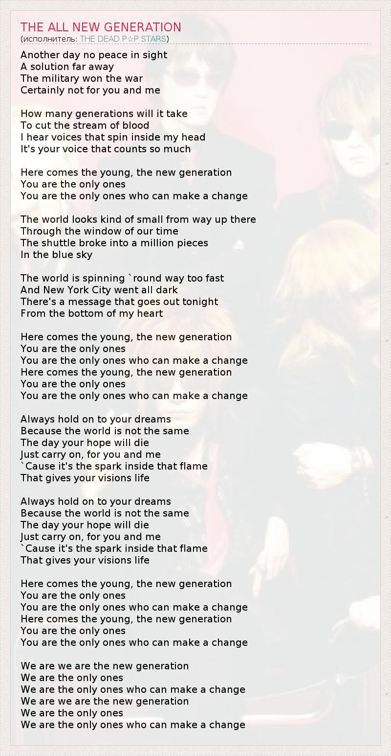Еще один день, ни намека на мир, До решения еще далеко. Солдаты выиграли войну, Но точно не для нас с тобой. Сколько еще понадобится поколений, Чтобы остановить поток крови? В моей голове - эхо голосов, Именно твой голос имеет силу! Идут молодые, новое поколение, И вы - единственные, Вы - единственные, кто может что-то изменить. Мир кажется каким-то маленьким, когда смотришь Оттуда, сверху, сквозь окно нашего времени. Наш корабль разбился на миллионы осколков В голубом небе... Наш мир слишком быстро ходит по кругу, Нью-Йорк весь под покровом темноты. У меня есть что сказать вам сегодня, И это слова из глубины моего сердца... Идут молодые, новое поколение, И вы - единственные, Вы - единственные, кто может что-то изменить. Идут молодые, новое поколение, И вы - единственные, Вы - единственные, кто может что-то изменить. Всегда держись за свои мечты, Потому что мир уже не тот, И в тот день, когда умрет твоя надежда, Просто живи дальше, для себя и для меня, Потому что именно искра из этого пламени Оживляет твои видения и мечты... Всегда держись за свои мечты, Потому что мир уже не тот, И в тот день, когда умрет твоя надежда, Просто живи дальше, для себя и для меня, Потому что именно искра из этого пламени Оживляет твои видения и мечты... Идут молодые, новое поколение, И вы - единственные, Вы - единственные, кто может что-то изменить. Идут молодые, новое поколение, И вы - единственные, Вы - единственные, кто может что-то изменить. Мы, мы - новое поколение, И мы - единственные, Мы - единственные, кто может что-то изменить. Мы, мы - новое поколение, И мы - единственные, Мы - единственные, кто может что-то изменить.