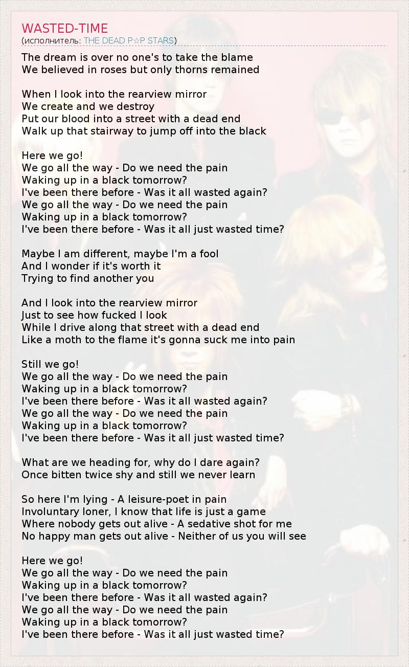 Грёзы закончились, некому взять вину на себя. Мы верили в розы, но остались лишь шипы. Когда я оглядываюсь назад 1, я вижу как Мы создаём и разрушаем, Проливаем кровь на улице, оканчивающейся тупиком, Поднимаемся по лестнице, чтобы спрыгнуть в черноту. Поехали! Мы идём до конца - нужна ли нам боль, Когда мы просыпаемся в чёрном завтра? Я уже видел это раньше - неужели всё это вновь было напрасно? Мы идём до конца - нужна ли нам боль, Когда мы просыпаемся в чёрном завтра? Я уже видел это раньше. Неужели всё это - лишь впустую потерянное время?.. Быть может, я другой, быть может, я дурак, И я задаюсь вопросом, стоит ли оно того, Искать другую тебя?.. И я оглядываюсь назад, Просто чтобы увидеть, каким обманутым я выгляжу, Пока я еду по этой улице, заканчивающейся тупиком, Как мотылёк на пламя. Всё это причинит мне боль... И вновь поехали! Мы идём до конца - нужна ли нам боль, Когда мы просыпаемся в чёрном завтра? Я уже видел это раньше - неужели всё это вновь было напрасно? Мы идём до конца - нужна ли нам боль, Когда мы просыпаемся в чёрном завтра? Я уже видел это раньше. Неужели всё это - лишь впустую потерянное время?.. К чему мы идём, зачем я вновь осмеливаюсь на это? Обжёгшись на молоке, будешь дуть и на воду, но мы всё равно ничему не учимся. И вот я лежу - страдающий свободный поэт. Вынужденный одиночка, я знаю, что жизнь - это просто игра, Из которой никто не выходит живым - это прямо-таки доза успокоительного для меня. Ни один счастливчик не выйдет живым - Никто из нас, вот увидишь. Поехали! Мы идём до конца - нужна ли нам боль, Когда мы просыпаемся в чёрном завтра? Я уже видел это раньше - неужели всё это вновь было напрасно? Мы идём до конца - нужна ли нам боль, Когда мы просыпаемся в чёрном завтра? Я уже видел это раньше. Неужели всё это - лишь впустую потерянное время?.. 1 - дословно: когда я смотрю в зеркало заднего вида