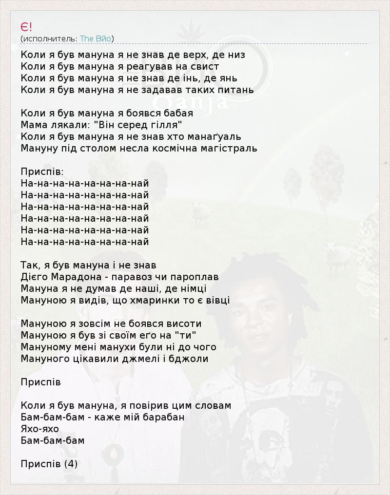 Коли я був мануна я не знав де верх, де низ Коли я був мануна я реагував на свист Коли я був мануна я не знав де інь, де янь Коли я був мануна я не задавав таких питань Коли я був мануна я боявся бабая Мама лякали: "Він серед гілля" Коли я був мануна я не знав хто манаґуаль Мануну під столом несла космічна магістраль Приспів: На-на-на-на-на-на-на-най На-на-на-на-на-на-на-най На-на-на-на-на-на-на-най На-на-на-на-на-на-на-най На-на-на-на-на-на-на-най На-на-на-на-на-на-на-най Так, я був мануна і не знав Дієго Марадона - паравоз чи пароплав Мануна я не думав де наші, де німці Мануною я видів, що хмаринки то є вівці Мануною я зовсім не боявся висоти Мануною я був зі своїм еґо на "ти" Мануному мені манухи були ні до чого Мануного цікавили джмелі і бджоли Приспів Коли я був мануна, я повірив цим словам Бам-бам-бам - каже мій барабан Яхо-яхо Бам-бам-бам Приспів (4)