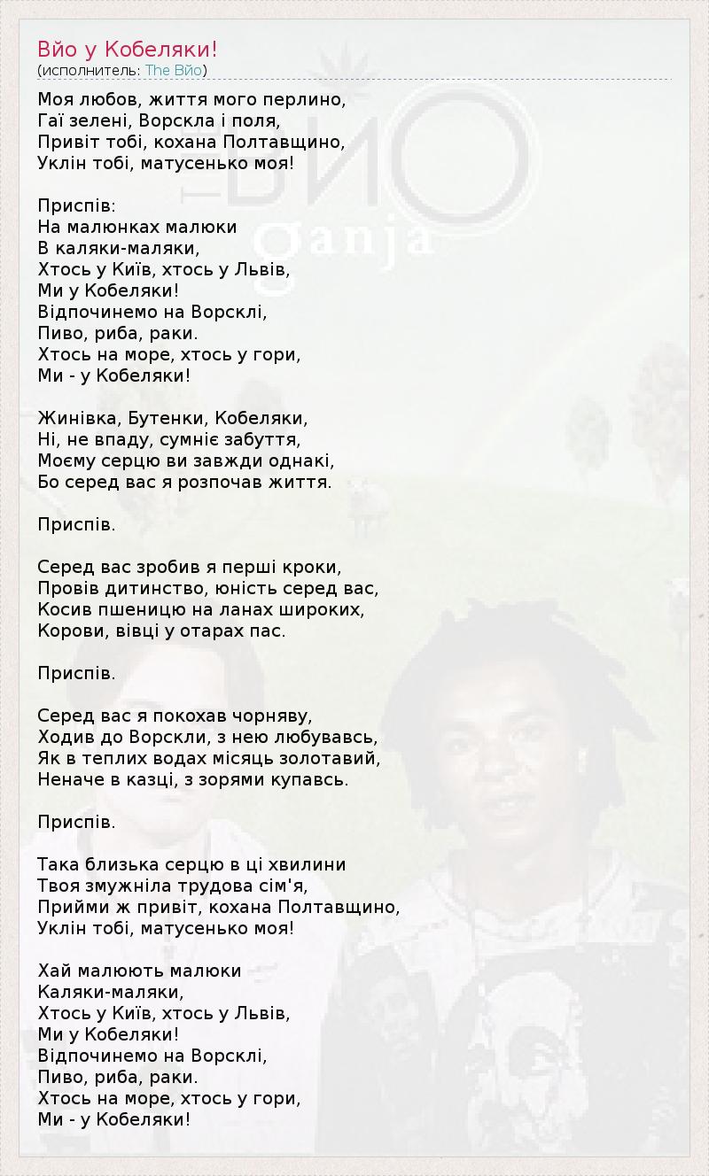 Моя любов, життя мого перлино, Гаї зелені, Ворскла і поля, Привіт тобі, кохана Полтавщино, Уклін тобі, матусенько моя! Приспів: На малюнках малюки В каляки-маляки, Хтось у Київ, хтось у Львів, Ми у Кобеляки! Відпочинемо на Ворсклі, Пиво, риба, раки. Хтось на море, хтось у гори, Ми - у Кобеляки! Жинівка, Бутенки, Кобеляки, Ні, не впаду, сумніє забуття, Моєму серцю ви завжди однакі, Бо серед вас я розпочав життя. Приспів. Серед вас зробив я перші кроки, Провів дитинство, юність серед вас, Косив пшеницю на ланах широких, Корови, вівці у отарах пас. Приспів. Серед вас я покохав чорняву, Ходив до Ворскли, з нею любувавсь, Як в теплих водах місяць золотавий, Неначе в казці, з зорями купавсь. Приспів. Така близька серцю в ці хвилини Твоя змужніла трудова сім'я, Прийми ж привіт, кохана Полтавщино, Уклін тобі, матусенько моя! Хай малюють малюки Каляки-маляки, Хтось у Київ, хтось у Львів, Ми у Кобеляки! Відпочинемо на Ворсклі, Пиво, риба, раки. Хтось на море, хтось у гори, Ми - у Кобеляки!