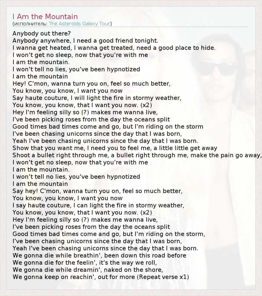 Anybody out there? Anybody anywhere, I need a good friend tonight. I wanna get heated, I wanna get treated, need a good place to hide. I won't get no sleep, now that you're with me I am the mountain. I won't tell no lies, you've been hypnotized I am the mountain Hey! C'mon, wanna turn you on, feel so much better, You know, you know, I want you now Say haute couture, I will light the fire in stormy weather, You know, you know, that I want you now. (x2) Hey I'm feeling silly so (?) makes me wanna live, I've been picking roses from the day the oceans split Good times bad times come and go, but I'm riding on the storm I've been chasing unicorns since the day that I was born, Yeah I've been chasing unicorns since the day that I was born. Show that you want me, I need you to feel me, a little little get away Shoot a bullet right through me, a bullet right through me, make the pain go away, I won't get no sleep, now that you're with me I am the mountain. I won't tell no lies, you've been hypnotized I am the mountain Say hey! C'mon, wanna turn you on, feel so much better, You know, you know, I want you now I say haute couture, I can light the fire in stormy weather, You know, you know, that I want you now. (x2) Hey I'm feeling silly so (?) makes me wanna live, I've been picking roses from the day the oceans split Good times bad times come and go, but I'm riding on the storm, I've been chasing unicorns since the day that I was born, Yeah I've been chasing unicorns since the day that I was born. We gonna die while breathin', been down this road before We gonna die for the feelin', it's the way we roll, We gonna die while dreamin', naked on the shore, We gonna keep on reachin', out for more (Repeat verse x1)