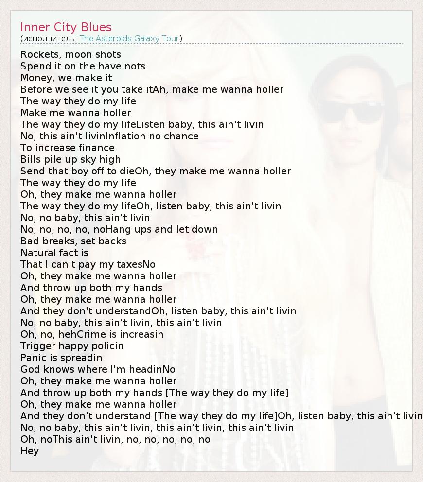 Rockets, moon shots Spend it on the have nots Money, we make it Before we see it you take itAh, make me wanna holler The way they do my life Make me wanna holler The way they do my lifeListen baby, this ain't livin No, this ain't livinInflation no chance To increase finance Bills pile up sky high Send that boy off to dieOh, they make me wanna holler The way they do my life Oh, they make me wanna holler The way they do my lifeOh, listen baby, this ain't livin No, no baby, this ain't livin No, no, no, no, noHang ups and let down Bad breaks, set backs Natural fact is That I can't pay my taxesNo Oh, they make me wanna holler And throw up both my hands Oh, they make me wanna holler And they don't understandOh, listen baby, this ain't livin No, no baby, this ain't livin, this ain't livin Oh, no, hehCrime is increasin Trigger happy policin Panic is spreadin God knows where I'm headinNo Oh, they make me wanna holler And throw up both my hands [The way they do my life] Oh, they make me wanna holler And they don't understand [The way they do my life]Oh, listen baby, this ain't livin No, no baby, this ain't livin, this ain't livin, this ain't livin Oh, noThis ain't livin, no, no, no, no, no Hey