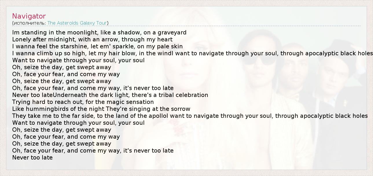 They take me to the far side, to the land of the apolloI want to navigate through your soul, through apocalyptic black holes