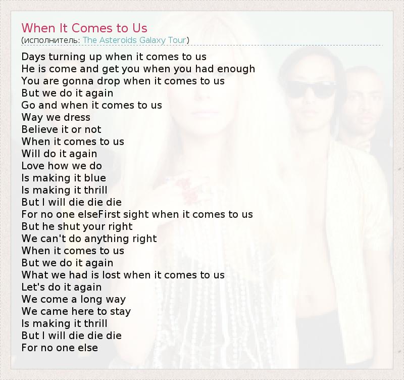 Days turning up when it comes to us He is come and get you when you had enough You are gonna drop when it comes to us But we do it again Go and when it comes to us Way we dress Believe it or not When it comes to us Will do it again Love how we do Is making it blue Is making it thrill But I will die die die For no one elseFirst sight when it comes to us But he shut your right We can't do anything right When it comes to us But we do it again What we had is lost when it comes to us Let's do it again We come a long way We came here to stay Is making it thrill But I will die die die For no one else