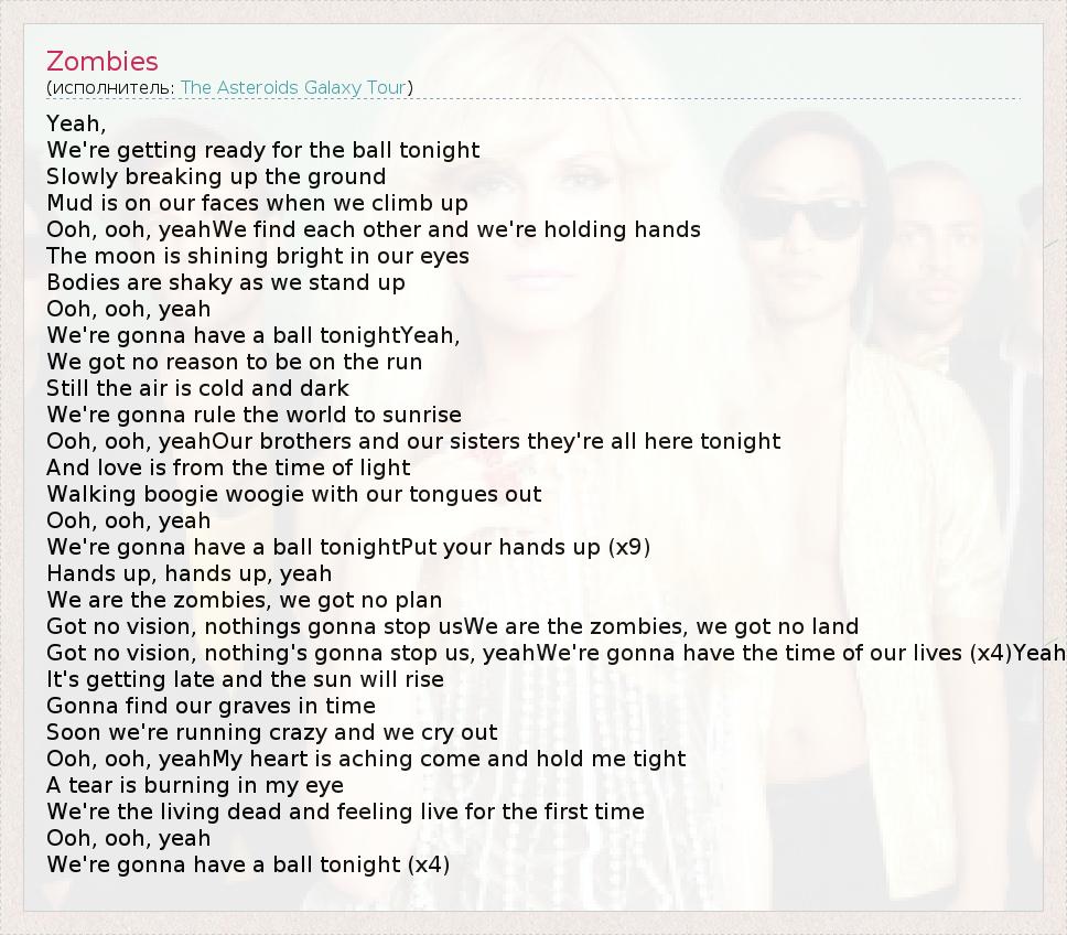 Yeah, We're getting ready for the ball tonight Slowly breaking up the ground Mud is on our faces when we climb up Ooh, ooh, yeahWe find each other and we're holding hands The moon is shining bright in our eyes Bodies are shaky as we stand up Ooh, ooh, yeah We're gonna have a ball tonightYeah, We got no reason to be on the run Still the air is cold and dark We're gonna rule the world to sunrise Ooh, ooh, yeahOur brothers and our sisters they're all here tonight And love is from the time of light Walking boogie woogie with our tongues out Ooh, ooh, yeah We're gonna have a ball tonightPut your hands up (x9) Hands up, hands up, yeah We are the zombies, we got no plan Got no vision, nothings gonna stop usWe are the zombies, we got no land Got no vision, nothing's gonna stop us, yeahWe're gonna have the time of our lives (x4)Yeah It's getting late and the sun will rise Gonna find our graves in time Soon we're running crazy and we cry out Ooh, ooh, yeahMy heart is aching come and hold me tight A tear is burning in my eye We're the living dead and feeling live for the first time Ooh, ooh, yeah We're gonna have a ball tonight (x4)