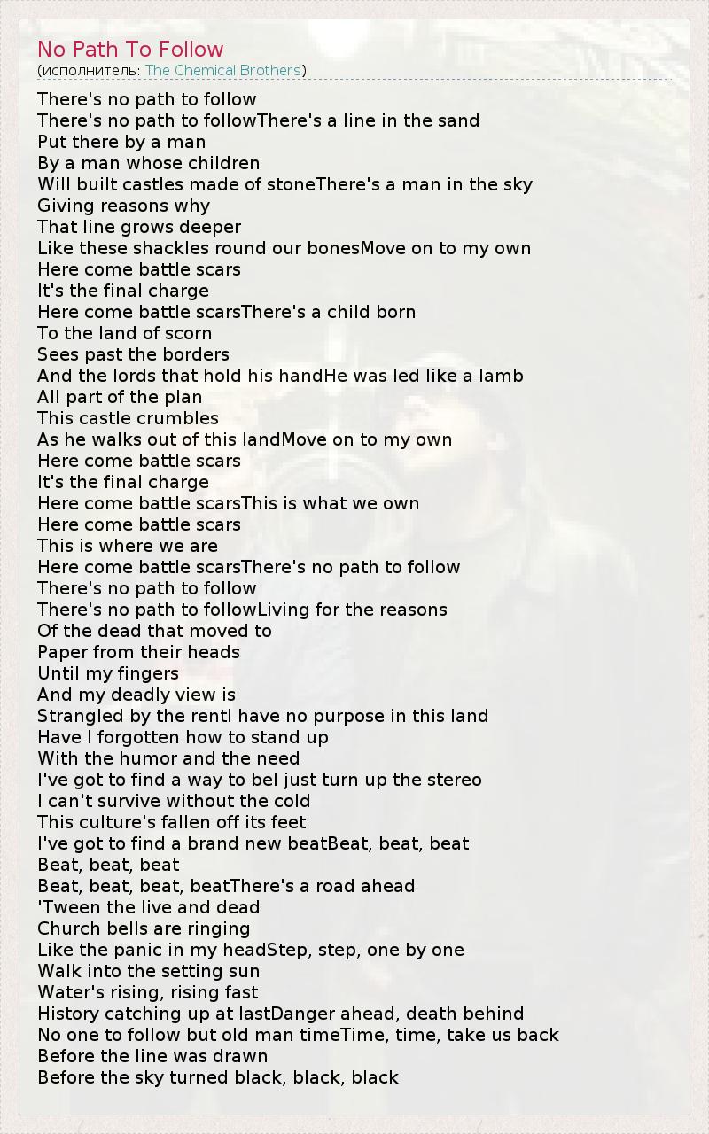 There's no path to follow There's no path to followThere's a line in the sand Put there by a man By a man whose children Will built castles made of stoneThere's a man in the sky Giving reasons why That line grows deeper Like these shackles round our bonesMove on to my own Here come battle scars It's the final charge Here come battle scarsThere's a child born To the land of scorn Sees past the borders And the lords that hold his handHe was led like a lamb All part of the plan This castle crumbles As he walks out of this landMove on to my own Here come battle scars It's the final charge Here come battle scarsThis is what we own Here come battle scars This is where we are Here come battle scarsThere's no path to follow There's no path to follow There's no path to followLiving for the reasons Of the dead that moved to Paper from their heads Until my fingers And my deadly view is Strangled by the rentI have no purpose in this land Have I forgotten how to stand up With the humor and the need I've got to find a way to beI just turn up the stereo I can't survive without the cold This culture's fallen off its feet I've got to find a brand new beatBeat, beat, beat Beat, beat, beat Beat, beat, beat, beatThere's a road ahead 'Tween the live and dead Church bells are ringing Like the panic in my headStep, step, one by one Walk into the setting sun Water's rising, rising fast History catching up at lastDanger ahead, death behind No one to follow but old man timeTime, time, take us back Before the line was drawn Before the sky turned black, black, black