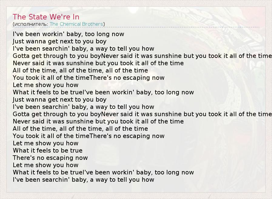 I've been workin' baby, too long now Just wanna get next to you boy I've been searchin' baby, a way to tell you how Gotta get through to you boyNever said it was sunshine but you took it all of the time Never said it was sunshine but you took it all of the time All of the time, all of the time, all of the time You took it all of the timeThere's no escaping now Let me show you how What it feels to be trueI've been workin' baby, too long now Just wanna get next to you boy I've been searchin' baby, a way to tell you how Gotta get through to you boyNever said it was sunshine but you took it all of the time Never said it was sunshine but you took it all of the time All of the time, all of the time, all of the time You took it all of the timeThere's no escaping now Let me show you how What it feels to be true There's no escaping now Let me show you how What it feels to be trueI've been workin' baby, too long now I've been searchin' baby, a way to tell you how