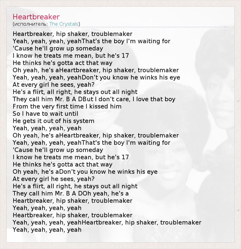 Yeah, yeah, yeah, yeahHeartbreaker, hip shaker, troublemaker