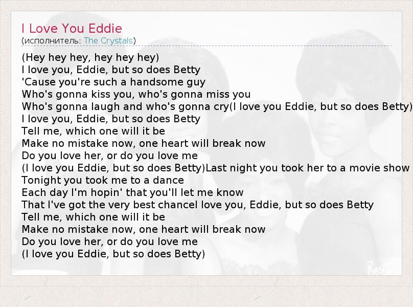 (Hey hey hey, hey hey hey) I love you, Eddie, but so does Betty 'Cause you're such a handsome guy Who's gonna kiss you, who's gonna miss you Who's gonna laugh and who's gonna cry(I love you Eddie, but so does Betty) I love you, Eddie, but so does Betty Tell me, which one will it be Make no mistake now, one heart will break now Do you love her, or do you love me (I love you Eddie, but so does Betty)Last night you took her to a movie show Tonight you took me to a dance Each day I'm hopin' that you'll let me know That I've got the very best chanceI love you, Eddie, but so does Betty Tell me, which one will it be Make no mistake now, one heart will break now Do you love her, or do you love me (I love you Eddie, but so does Betty)