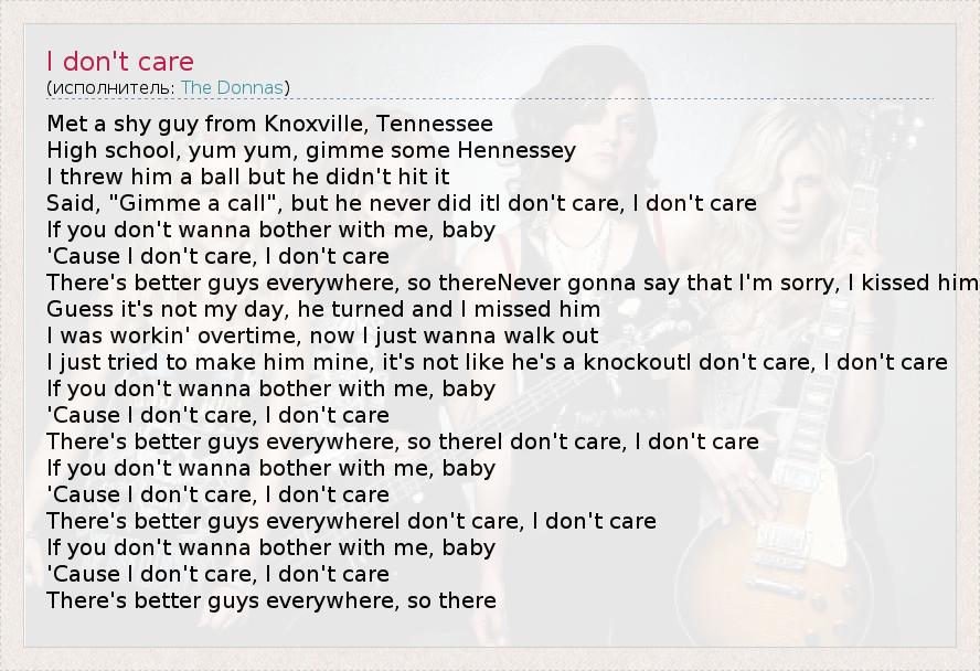 Met a shy guy from Knoxville, Tennessee High school, yum yum, gimme some Hennessey I threw him a ball but he didn't hit it Said, "Gimme a call", but he never did itI don't care, I don't care If you don't wanna bother with me, baby 'Cause I don't care, I don't care There's better guys everywhere, so thereNever gonna say that I'm sorry, I kissed him Guess it's not my day, he turned and I missed him I was workin' overtime, now I just wanna walk out I just tried to make him mine, it's not like he's a knockoutI don't care, I don't care If you don't wanna bother with me, baby 'Cause I don't care, I don't care There's better guys everywhere, so thereI don't care, I don't care If you don't wanna bother with me, baby 'Cause I don't care, I don't care There's better guys everywhereI don't care, I don't care If you don't wanna bother with me, baby 'Cause I don't care, I don't care There's better guys everywhere, so there