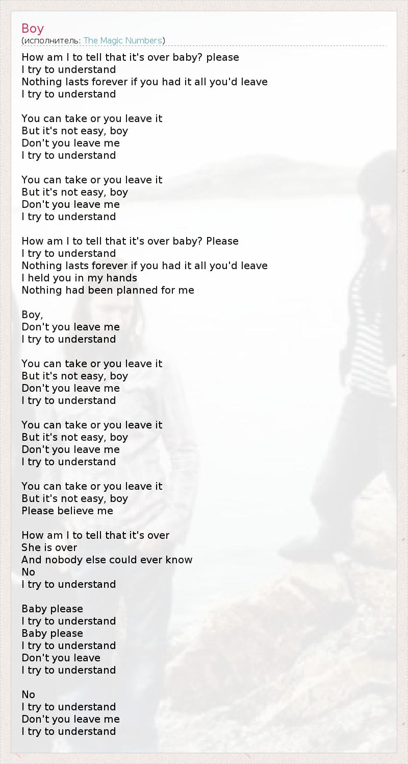 How am I to tell that it's over baby? please I try to understand Nothing lasts forever if you had it all you'd leave I try to understand You can take or you leave it But it's not easy, boy Don't you leave me I try to understand You can take or you leave it But it's not easy, boy Don't you leave me I try to understand How am I to tell that it's over baby? Please I try to understand Nothing lasts forever if you had it all you'd leave I held you in my hands Nothing had been planned for me Boy, Don't you leave me I try to understand You can take or you leave it But it's not easy, boy Don't you leave me I try to understand You can take or you leave it But it's not easy, boy Don't you leave me I try to understand You can take or you leave it But it's not easy, boy Please believe me How am I to tell that it's over She is over And nobody else could ever know No I try to understand Baby please I try to understand Baby please I try to understand Don't you leave I try to understand No I try to understand Don't you leave me I try to understand