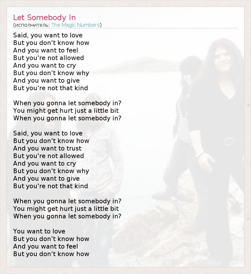 Said, you want to love But you don't know how And you want to feel But you're not allowed And you want to cry But you don't know why And you want to give But you're not that kind When you gonna let somebody in? You might get hurt just a little bit When you gonna let somebody in? Said, you want to love But you don't know how And you want to trust But you're not allowed And you want to cry But you don't know why And you want to give But you're not that kind When you gonna let somebody in? You might get hurt just a little bit When you gonna let somebody in? You want to love But you don't know how And you want to feel But you don't know how