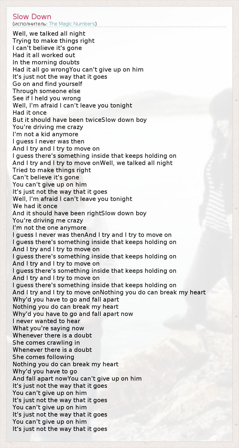Well, we talked all night Trying to make things right I can't believe it's gone Had it all worked out In the morning doubts Had it all go wrongYou can't give up on him It's just not the way that it goes Go on and find yourself Through someone else See if I held you wrong Well, I'm afraid I can't leave you tonight Had it once But it should have been twiceSlow down boy You're driving me crazy I'm not a kid anymore I guess I never was then And I try and I try to move on I guess there's something inside that keeps holding on And I try and I try to move onWell, we talked all night Tried to make things right Can't believe it's gone You can't give up on him It's just not the way that it goes Well, I'm afraid I can't leave you tonight We had it once And it should have been rightSlow down boy You're driving me crazy I'm not the one anymore I guess I never was thenAnd I try and I try to move on I guess there's something inside that keeps holding on And I try and I try to move on I guess there's something inside that keeps holding on And I try and I try to move on I guess there's something inside that keeps holding on And I try and I try to move on I guess there's something inside that keeps holding on And I try and I try to move onNothing you do can break my heart Why'd you have to go and fall apart Nothing you do can break my heart Why'd you have to go and fall apart now I never wanted to hear What you're saying now Whenever there is a doubt She comes crawling in Whenever there is a doubt She comes following Nothing you do can break my heart Why'd you have to go And fall apart nowYou can't give up on him It's just not the way that it goes You can't give up on him It's just not the way that it goes You can't give up on him It's just not the way that it goes You can't give up on him It's just not the way that it goes