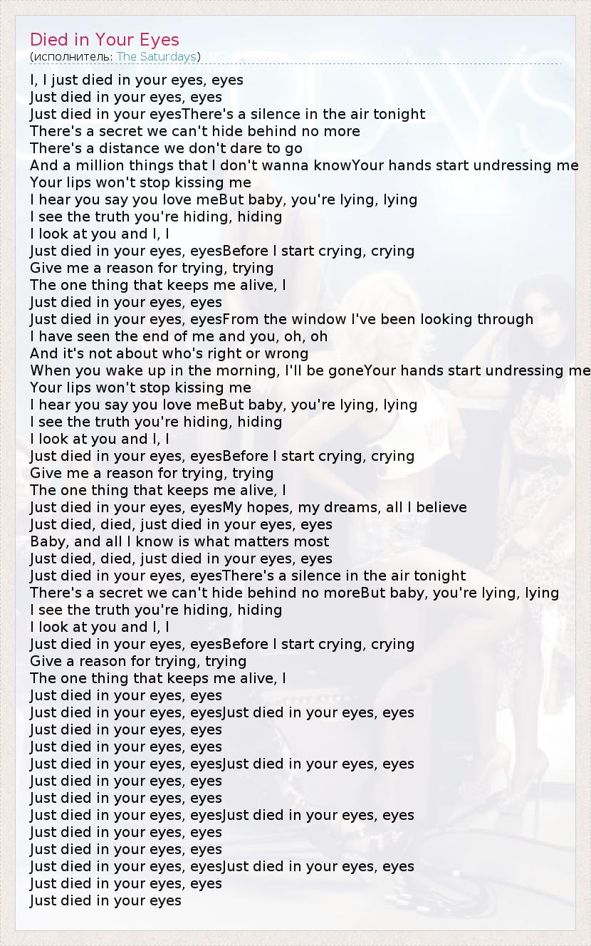 I, I just died in your eyes, eyes Just died in your eyes, eyes Just died in your eyesThere's a silence in the air tonight There's a secret we can't hide behind no more There's a distance we don't dare to go And a million things that I don't wanna knowYour hands start undressing me Your lips won't stop kissing me I hear you say you love meBut baby, you're lying, lying I see the truth you're hiding, hiding I look at you and I, I Just died in your eyes, eyesBefore I start crying, crying Give me a reason for trying, trying The one thing that keeps me alive, I Just died in your eyes, eyes Just died in your eyes, eyesFrom the window I've been looking through I have seen the end of me and you, oh, oh And it's not about who's right or wrong When you wake up in the morning, I'll be goneYour hands start undressing me Your lips won't stop kissing me I hear you say you love meBut baby, you're lying, lying I see the truth you're hiding, hiding I look at you and I, I Just died in your eyes, eyesBefore I start crying, crying Give me a reason for trying, trying The one thing that keeps me alive, I Just died in your eyes, eyesMy hopes, my dreams, all I believe Just died, died, just died in your eyes, eyes Baby, and all I know is what matters most Just died, died, just died in your eyes, eyes Just died in your eyes, eyesThere's a silence in the air tonight There's a secret we can't hide behind no moreBut baby, you're lying, lying I see the truth you're hiding, hiding I look at you and I, I Just died in your eyes, eyesBefore I start crying, crying Give a reason for trying, trying The one thing that keeps me alive, I Just died in your eyes, eyes Just died in your eyes, eyesJust died in your eyes, eyes Just died in your eyes, eyes Just died in your eyes, eyes Just died in your eyes, eyesJust died in your eyes, eyes Just died in your eyes, eyes Just died in your eyes, eyes Just died in your eyes, eyesJust died in your eyes, eyes Just died in your eyes, eyes Just died in your eyes, eyes Just died in your eyes, eyesJust died in your eyes, eyes Just died in your eyes, eyes Just died in your eyes