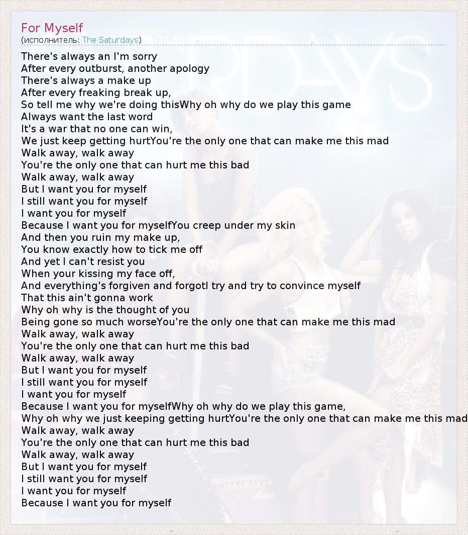 There's always an I'm sorry After every outburst, another apology There's always a make up After every freaking break up, So tell me why we're doing thisWhy oh why do we play this game Always want the last word It's a war that no one can win, We just keep getting hurtYou're the only one that can make me this mad Walk away, walk away You're the only one that can hurt me this bad Walk away, walk away But I want you for myself I still want you for myself I want you for myself Because I want you for myselfYou creep under my skin And then you ruin my make up, You know exactly how to tick me off And yet I can't resist you When your kissing my face off, And everything's forgiven and forgotI try and try to convince myself That this ain't gonna work Why oh why is the thought of you Being gone so much worseYou're the only one that can make me this mad Walk away, walk away You're the only one that can hurt me this bad Walk away, walk away But I want you for myself I still want you for myself I want you for myself Because I want you for myselfWhy oh why do we play this game, Why oh why we just keeping getting hurtYou're the only one that can make me this mad Walk away, walk away You're the only one that can hurt me this bad Walk away, walk away But I want you for myself I still want you for myself I want you for myself Because I want you for myself