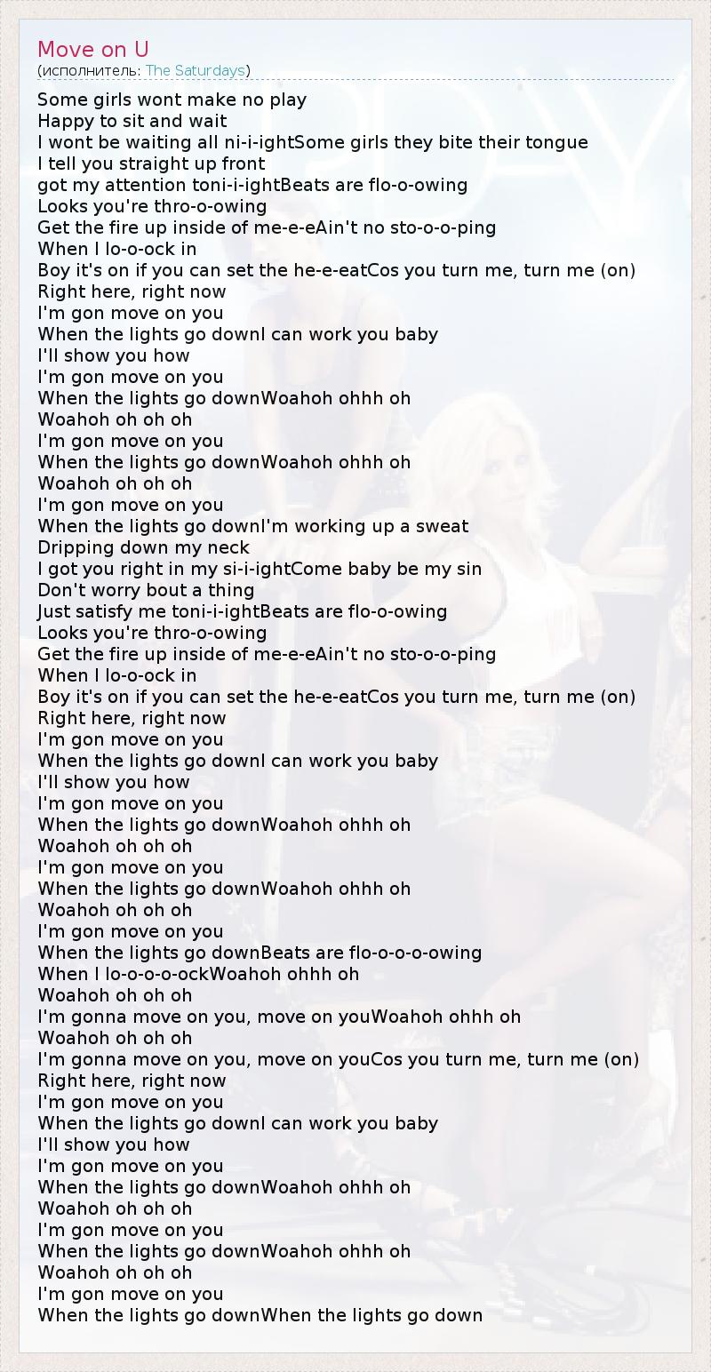 Some girls wont make no play Happy to sit and wait I wont be waiting all ni-i-ightSome girls they bite their tongue I tell you straight up front got my attention toni-i-ightBeats are flo-o-owing Looks you're thro-o-owing Get the fire up inside of me-e-eAin't no sto-o-o-ping When I lo-o-ock in Boy it's on if you can set the he-e-eatCos you turn me, turn me (on) Right here, right now I'm gon move on you When the lights go downI can work you baby I'll show you how I'm gon move on you When the lights go downWoahoh ohhh oh Woahoh oh oh oh I'm gon move on you When the lights go downWoahoh ohhh oh Woahoh oh oh oh I'm gon move on you When the lights go downI'm working up a sweat Dripping down my neck I got you right in my si-i-ightCome baby be my sin Don't worry bout a thing Just satisfy me toni-i-ightBeats are flo-o-owing Looks you're thro-o-owing Get the fire up inside of me-e-eAin't no sto-o-o-ping When I lo-o-ock in Boy it's on if you can set the he-e-eatCos you turn me, turn me (on) Right here, right now I'm gon move on you When the lights go downI can work you baby I'll show you how I'm gon move on you When the lights go downWoahoh ohhh oh Woahoh oh oh oh I'm gon move on you When the lights go downWoahoh ohhh oh Woahoh oh oh oh I'm gon move on you When the lights go downBeats are flo-o-o-o-owing When I lo-o-o-o-ockWoahoh ohhh oh Woahoh oh oh oh I'm gonna move on you, move on youWoahoh ohhh oh Woahoh oh oh oh I'm gonna move on you, move on youCos you turn me, turn me (on) Right here, right now I'm gon move on you When the lights go downI can work you baby I'll show you how I'm gon move on you When the lights go downWoahoh ohhh oh Woahoh oh oh oh I'm gon move on you When the lights go downWoahoh ohhh oh Woahoh oh oh oh I'm gon move on you When the lights go downWhen the lights go down