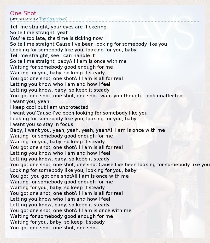 Tell me straight, your eyes are flickering So tell me straight, yeah You're too late, the time is ticking now So tell me straight'Cause I've been looking for somebody like you Looking for somebody like you, looking for you, baby Tell me straight, see I can handle it So tell me straight, babyAll I am is once with me Waiting for somebody good enough for me Waiting for you, baby, so keep it steady You got one shot, one shotAll I am is all for real Letting you know who I am and how I feel Letting you know, baby, so keep it steady You got one shot, one shot, one shotI want you though I look unaffected I want you, yeah I keep cool but I am unprotected I want you'Cause I've been looking for somebody like you Looking for somebody like you, looking for you, baby I want you so stay in focus Baby, I want you, yeah, yeah, yeah, yeahAll I am is once with me Waiting for somebody good enough for me Waiting for you, baby, so keep it steady You got one shot, one shotAll I am is all for real Letting you know who I am and how I feel Letting you know, baby, so keep it steady You got one shot, one shot, one shot'Cause I've been looking for somebody like you Looking for somebody like you, looking for you, baby You got, you got one shotAll I am is once with me Waiting for somebody good enough for me Waiting for you, baby, so keep it steady You got one shot, one shotAll I am is all for real Letting you know who I am and how I feel Letting you know, baby, so keep it steady You got one shot, one shotAll I am is once with me Waiting for somebody good enough for me Waiting for you, baby, so keep it steady You got one shot, one shot, one shot