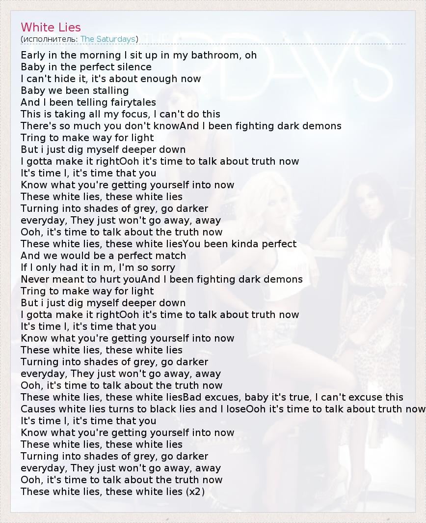 Early in the morning I sit up in my bathroom, oh Baby in the perfect silence I can't hide it, it's about enough now Baby we been stalling And I been telling fairytales This is taking all my focus, I can't do this There's so much you don't knowAnd I been fighting dark demons Tring to make way for light But i just dig myself deeper down I gotta make it rightOoh it's time to talk about truth now It's time I, it's time that you Know what you're getting yourself into now These white lies, these white lies Turning into shades of grey, go darker everyday, They just won't go away, away Ooh, it's time to talk about the truth now These white lies, these white liesYou been kinda perfect And we would be a perfect match If I only had it in m, I'm so sorry Never meant to hurt youAnd I been fighting dark demons Tring to make way for light But i just dig myself deeper down I gotta make it rightOoh it's time to talk about truth now It's time I, it's time that you Know what you're getting yourself into now These white lies, these white lies Turning into shades of grey, go darker everyday, They just won't go away, away Ooh, it's time to talk about the truth now These white lies, these white liesBad excues, baby it's true, I can't excuse this Causes white lies turns to black lies and I loseOoh it's time to talk about truth now It's time I, it's time that you Know what you're getting yourself into now These white lies, these white lies Turning into shades of grey, go darker everyday, They just won't go away, away Ooh, it's time to talk about the truth now These white lies, these white lies (x2)
