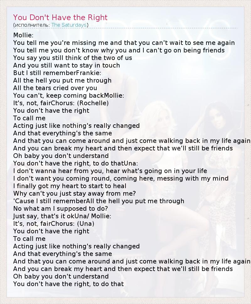 Mollie: You tell me you're missing me and that you can't wait to see me again You tell me you don't know why you and I can't go on being friends You say you still think of the two of us And you still want to stay in touch But I still rememberFrankie: All the hell you put me through All the tears cried over you You can't, keep coming backMollie: It's, not, fairChorus: (Rochelle) You don't have the right To call me Acting just like nothing's really changed And that everything's the same And that you can come around and just come walking back in my life again And you can break my heart and then expect that we'll still be friends Oh baby you don't understand You don't have the right, to do thatUna: I don't wanna hear from you, hear what's going on in your life I don't want you coming round, coming here, messing with my mind I finally got my heart to start to heal Why can't you just stay away from me? 'Cause I still rememberAll the hell you put me through No what am I supposed to do? Just say, that's it okUna/ Mollie: It's, not, fairChorus: (Una) You don't have the right To call me Acting just like nothing's really changed And that everything's the same And that you can come around and just come walking back in my life again And you can break my heart and then expect that we'll still be friends Oh baby you don't understand You don't have the right, to do that