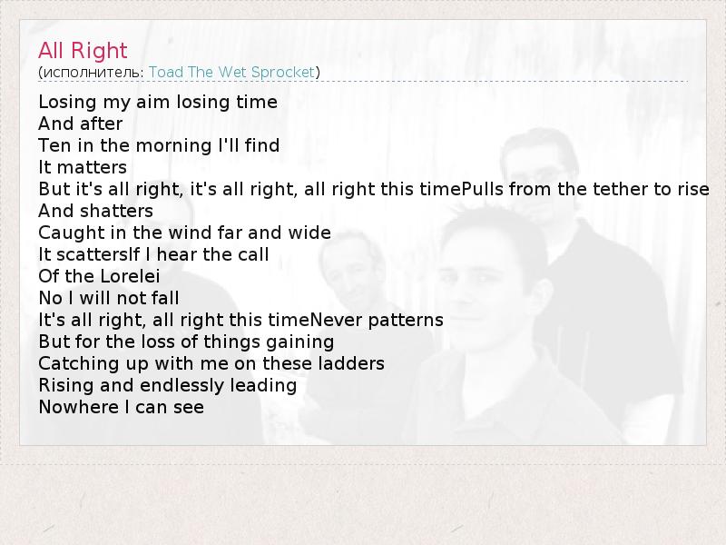 Это интересно:Toad the Wet Sprocket, американская альтернативная поп-рок-группа. Образована в 1986 в Санта-Барбаре, Калифорния. Группа была основана уроженцами Санта-Барбары, один из которых — Дин Диннинг — с рождения имел прямое отношение к музыке (его дядей был известный в 1950-е гг. «хит-мэйкер» Марк «Тин Энджел» Диннинг, Mark «Teen Angel» Dinning). После активных выступлений в городских барах, в 1988 группа записала демо-запись... продолжение