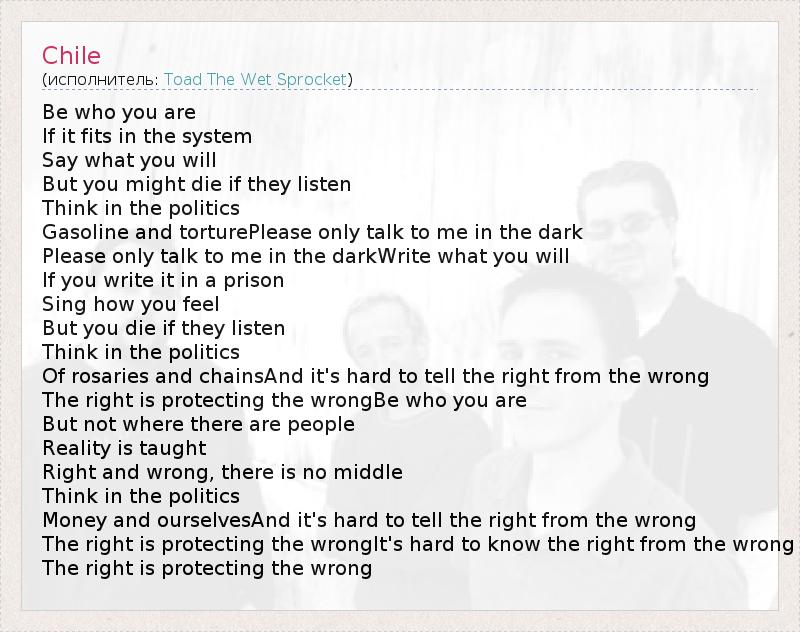 Be who you are If it fits in the system Say what you will But you might die if they listen Think in the politics Gasoline and torturePlease only talk to me in the dark Please only talk to me in the darkWrite what you will If you write it in a prison Sing how you feel But you die if they listen Think in the politics Of rosaries and chainsAnd it's hard to tell the right from the wrong The right is protecting the wrongBe who you are But not where there are people Reality is taught Right and wrong, there is no middle Think in the politics Money and ourselvesAnd it's hard to tell the right from the wrong The right is protecting the wrongIt's hard to know the right from the wrong The right is protecting the wrong