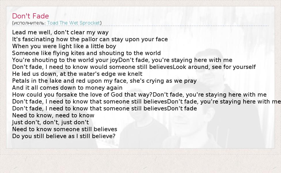 Don't fade, I need to know that someone still believesDon't fade, you're staying here with me
