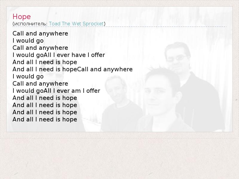 Это интересно:Toad the Wet Sprocket, американская альтернативная поп-рок-группа. Образована в 1986 в Санта-Барбаре, Калифорния. Группа была основана уроженцами Санта-Барбары, один из которых — Дин Диннинг — с рождения имел прямое отношение к музыке (его дядей был известный в 1950-е гг. «хит-мэйкер» Марк «Тин Энджел» Диннинг, Mark «Teen Angel» Dinning). После активных выступлений в городских барах, в 1988 группа записала демо-запись... продолжение