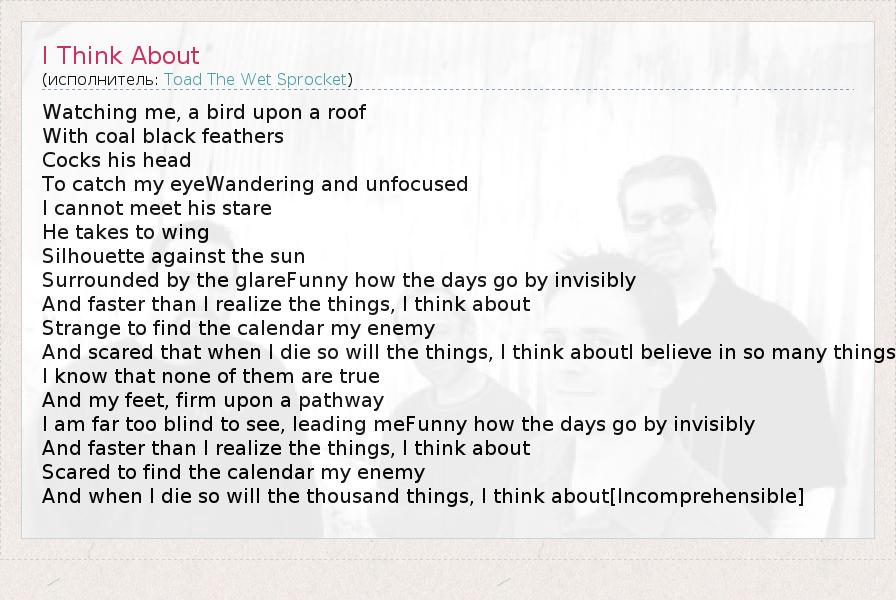 Это интересно:Toad the Wet Sprocket, американская альтернативная поп-рок-группа. Образована в 1986 в Санта-Барбаре, Калифорния. Группа была основана уроженцами Санта-Барбары, один из которых — Дин Диннинг — с рождения имел прямое отношение к музыке (его дядей был известный в 1950-е гг. «хит-мэйкер» Марк «Тин Энджел» Диннинг, Mark «Teen Angel» Dinning). После активных выступлений в городских барах, в 1988 группа записала демо-запись... продолжение