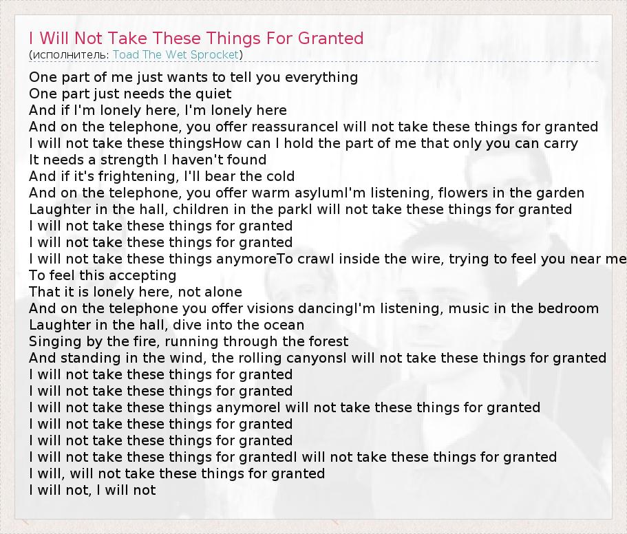 А как ты думаешь, о чем песня "I Will Not Take These Things For Granted" ?