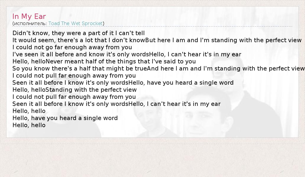 Это интересно:Toad the Wet Sprocket, американская альтернативная поп-рок-группа. Образована в 1986 в Санта-Барбаре, Калифорния. Группа была основана уроженцами Санта-Барбары, один из которых — Дин Диннинг — с рождения имел прямое отношение к музыке (его дядей был известный в 1950-е гг. «хит-мэйкер» Марк «Тин Энджел» Диннинг, Mark «Teen Angel» Dinning). После активных выступлений в городских барах, в 1988 группа записала демо-запись... продолжение