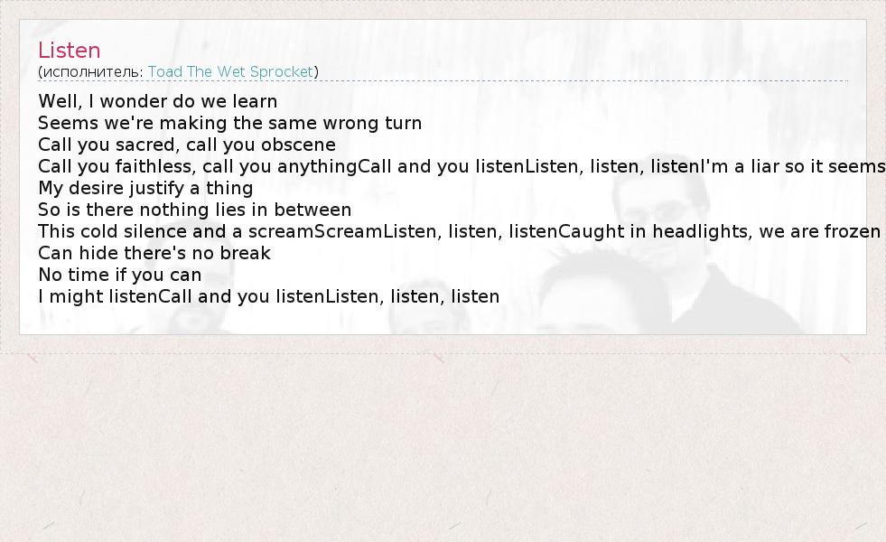Это интересно:Toad the Wet Sprocket, американская альтернативная поп-рок-группа. Образована в 1986 в Санта-Барбаре, Калифорния. Группа была основана уроженцами Санта-Барбары, один из которых — Дин Диннинг — с рождения имел прямое отношение к музыке (его дядей был известный в 1950-е гг. «хит-мэйкер» Марк «Тин Энджел» Диннинг, Mark «Teen Angel» Dinning). После активных выступлений в городских барах, в 1988 группа записала демо-запись... продолжение