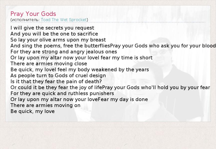А как ты думаешь, о чем песня "Pray Your Gods" ?