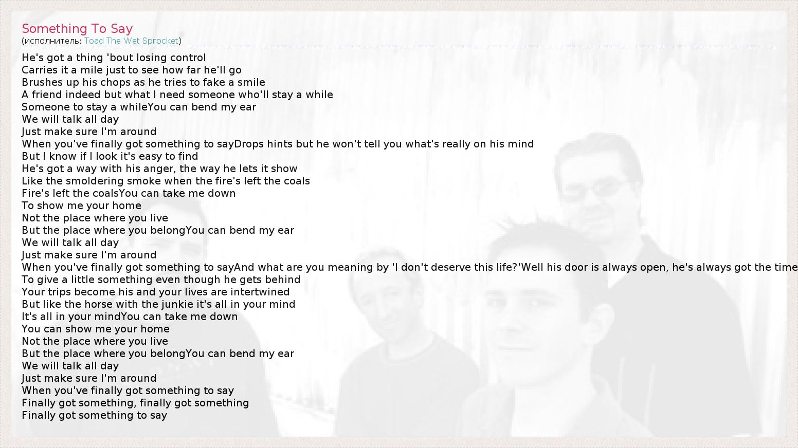 Это интересно:Toad the Wet Sprocket, американская альтернативная поп-рок-группа. Образована в 1986 в Санта-Барбаре, Калифорния. Группа была основана уроженцами Санта-Барбары, один из которых — Дин Диннинг — с рождения имел прямое отношение к музыке (его дядей был известный в 1950-е гг. «хит-мэйкер» Марк «Тин Энджел» Диннинг, Mark «Teen Angel» Dinning). После активных выступлений в городских барах, в 1988 группа записала демо-запись... продолжение