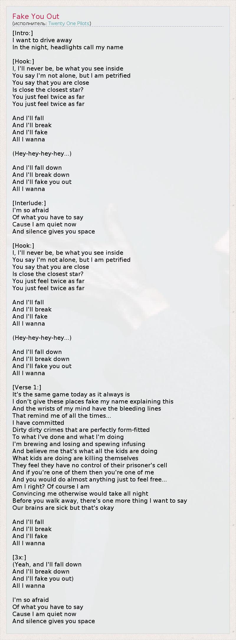 [Intro:] I want to drive away In the night, headlights call my name [Hook:] I, I'll never be, be what you see inside You say I'm not alone, but I am petrified You say that you are close Is close the closest star? You just feel twice as far You just feel twice as far And I'll fall And I'll break And I'll fake All I wanna (Hey-hey-hey-hey...) And I'll fall down And I'll break down And I'll fake you out All I wanna [Interlude:] I'm so afraid Of what you have to say Cause I am quiet now And silence gives you space [Hook:] I, I'll never be, be what you see inside You say I'm not alone, but I am petrified You say that you are close Is close the closest star? You just feel twice as far You just feel twice as far And I'll fall And I'll break And I'll fake All I wanna (Hey-hey-hey-hey...) And I'll fall down And I'll break down And I'll fake you out All I wanna [Verse 1:] It's the same game today as it always is I don't give these places fake my name explaining this And the wrists of my mind have the bleeding lines That remind me of all the times... I have committed Dirty dirty crimes that are perfectly form-fitted To what I've done and what I'm doing I'm brewing and losing and spewing infusing And believe me that's what all the kids are doing What kids are doing are killing themselves They feel they have no control of their prisoner's cell And if you're one of them then you're one of me And you would do almost anything just to feel free... Am I right? Of course I am Convincing me otherwise would take all night Before you walk away, there's one more thing I want to say Our brains are sick but that's okay And I'll fall And I'll break And I'll fake All I wanna [3x:] (Yeah, and I'll fall down And I'll break down And I'll fake you out) All I wanna I'm so afraid Of what you have to say Cause I am quiet now And silence gives you space