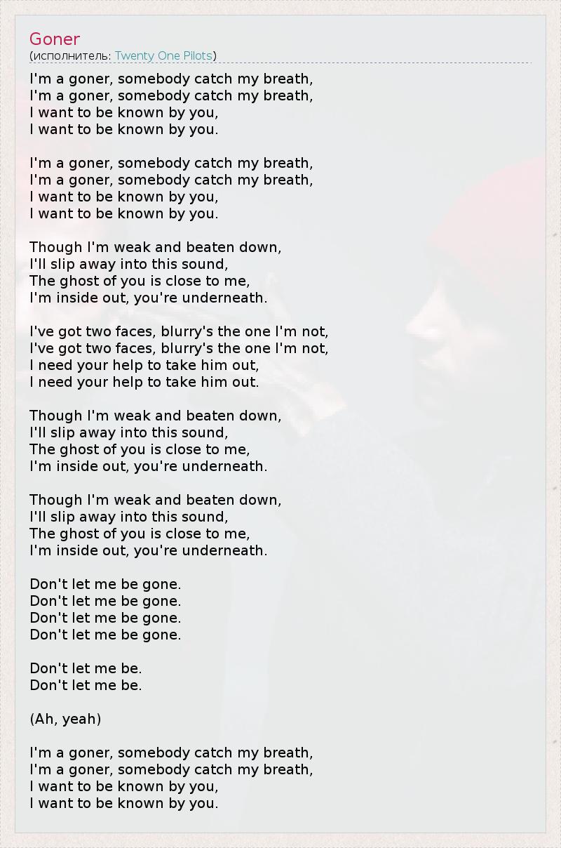 I'm a goner, somebody catch my breath, I'm a goner, somebody catch my breath, I want to be known by you, I want to be known by you. I'm a goner, somebody catch my breath, I'm a goner, somebody catch my breath, I want to be known by you, I want to be known by you. Though I'm weak and beaten down, I'll slip away into this sound, The ghost of you is close to me, I'm inside out, you're underneath. I've got two faces, blurry's the one I'm not, I've got two faces, blurry's the one I'm not, I need your help to take him out, I need your help to take him out. Though I'm weak and beaten down, I'll slip away into this sound, The ghost of you is close to me, I'm inside out, you're underneath. Though I'm weak and beaten down, I'll slip away into this sound, The ghost of you is close to me, I'm inside out, you're underneath. Don't let me be gone. Don't let me be gone. Don't let me be gone. Don't let me be gone. Don't let me be. Don't let me be. (Ah, yeah) I'm a goner, somebody catch my breath, I'm a goner, somebody catch my breath, I want to be known by you, I want to be known by you.