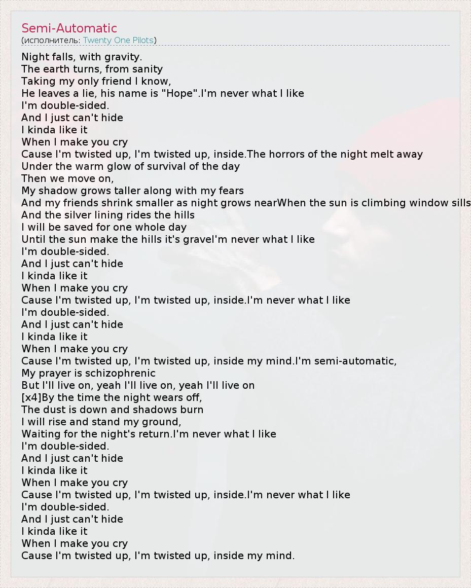 Cause I'm twisted up, I'm twisted up, inside my mind.I'm semi-automatic,