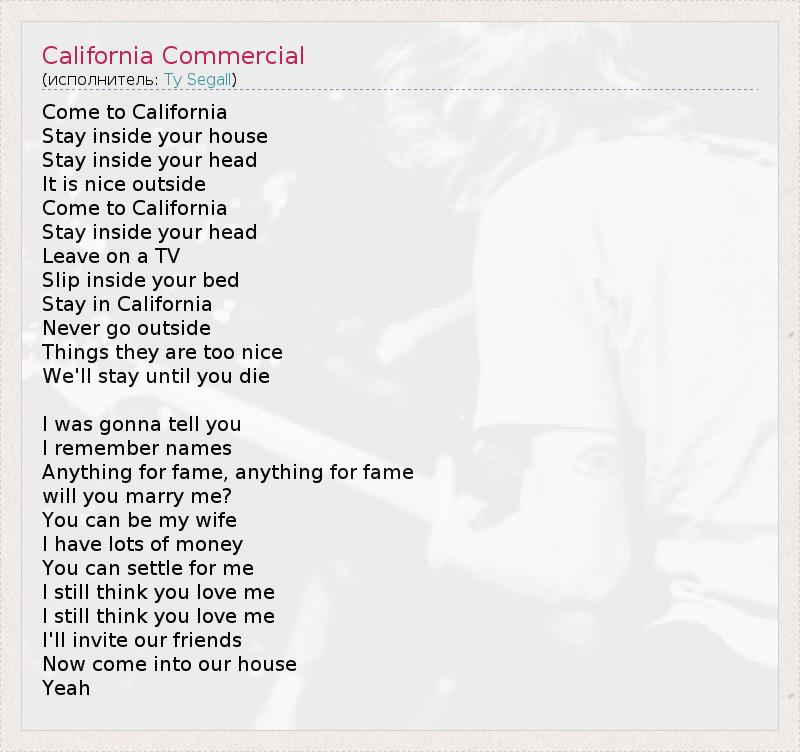 Come to California Stay inside your house Stay inside your head It is nice outside Come to California Stay inside your head Leave on a TV Slip inside your bed Stay in California Never go outside Things they are too nice We'll stay until you die I was gonna tell you I remember names Anything for fame, anything for fame will you marry me? You can be my wife I have lots of money You can settle for me I still think you love me I still think you love me I'll invite our friends Now come into our house Yeah