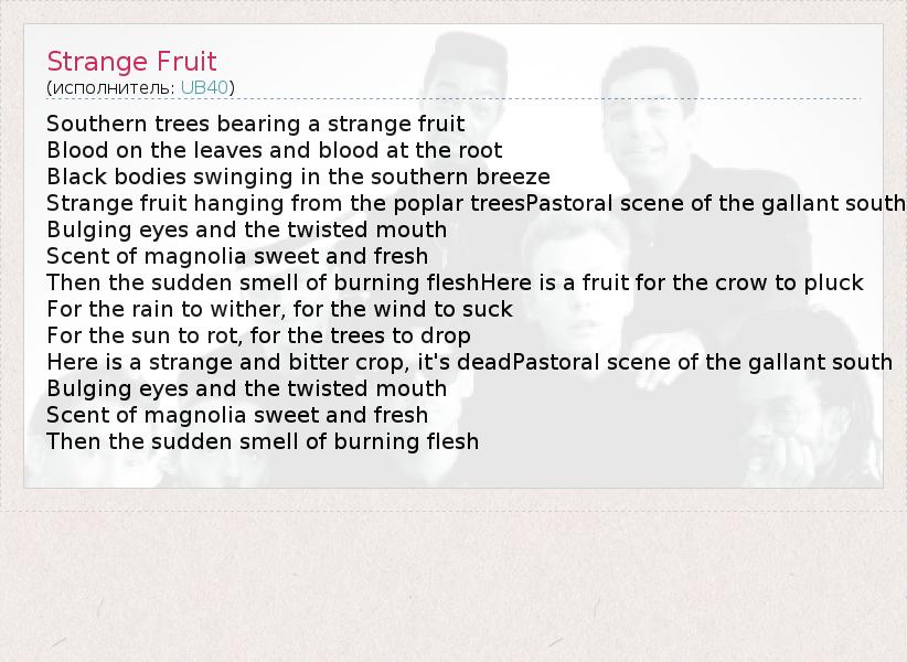 А как ты думаешь, о чем песня "Strange Fruit" ?