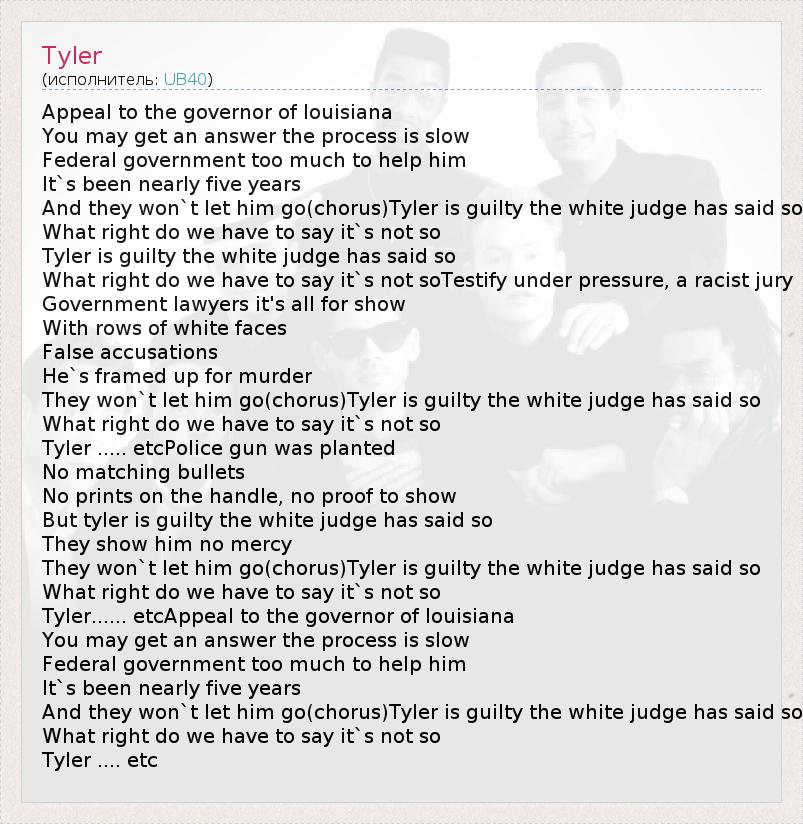 Appeal to the governor of louisiana You may get an answer the process is slow Federal government too much to help him It`s been nearly five years And they won`t let him go(chorus)Tyler is guilty the white judge has said so What right do we have to say it`s not so Tyler is guilty the white judge has said so What right do we have to say it`s not soTestify under pressure, a racist jury Government lawyers it's all for show With rows of white faces False accusations He`s framed up for murder They won`t let him go(chorus)Tyler is guilty the white judge has said so What right do we have to say it`s not so Tyler ..... etcPolice gun was planted No matching bullets No prints on the handle, no proof to show But tyler is guilty the white judge has said so They show him no mercy They won`t let him go(chorus)Tyler is guilty the white judge has said so What right do we have to say it`s not so Tyler...... etcAppeal to the governor of louisiana You may get an answer the process is slow Federal government too much to help him It`s been nearly five years And they won`t let him go(chorus)Tyler is guilty the white judge has said so What right do we have to say it`s not so Tyler .... etc