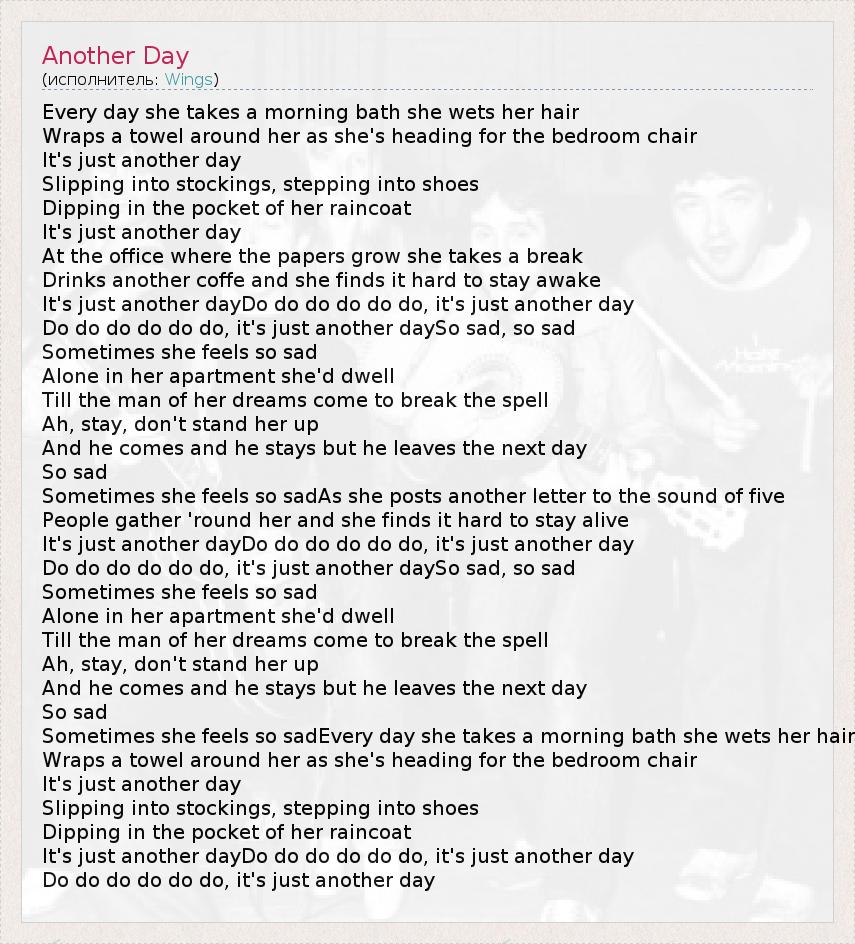 Every day she takes a morning bath she wets her hair Wraps a towel around her as she's heading for the bedroom chair It's just another day Slipping into stockings, stepping into shoes Dipping in the pocket of her raincoat It's just another day At the office where the papers grow she takes a break Drinks another coffe and she finds it hard to stay awake It's just another dayDo do do do do do, it's just another day Do do do do do do, it's just another daySo sad, so sad Sometimes she feels so sad Alone in her apartment she'd dwell Till the man of her dreams come to break the spell Ah, stay, don't stand her up And he comes and he stays but he leaves the next day So sad Sometimes she feels so sadAs she posts another letter to the sound of five People gather 'round her and she finds it hard to stay alive It's just another dayDo do do do do do, it's just another day Do do do do do do, it's just another daySo sad, so sad Sometimes she feels so sad Alone in her apartment she'd dwell Till the man of her dreams come to break the spell Ah, stay, don't stand her up And he comes and he stays but he leaves the next day So sad Sometimes she feels so sadEvery day she takes a morning bath she wets her hair Wraps a towel around her as she's heading for the bedroom chair It's just another day Slipping into stockings, stepping into shoes Dipping in the pocket of her raincoat It's just another dayDo do do do do do, it's just another day Do do do do do do, it's just another day
