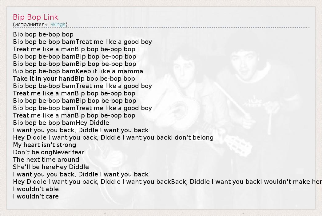 Bip bop be-bop bop Bip bop be-bop bamTreat me like a good boy Treat me like a manBip bop be-bop bop Bip bop be-bop bamBip bop be-bop bop Bip bop be-bop bamBip bop be-bop bop Bip bop be-bop bamKeep it like a mamma Take it in your handBip bop be-bop bop Bip bop be-bop bamTreat me like a good boy Treat me like a manBip bop be-bop bop Bip bop be-bop bamBip bop be-bop bop Bip bop be-bop bamTreat me like a good boy Treat me like a manBip bop be-bop bop Bip bop be-bop bamHey Diddle I want you you back, Diddle I want you back Hey Diddle I want you back, Diddle I want you backI don't belong My heart isn't strong Don't belongNever fear The next time around She'll be hereHey Diddle I want you you back, Diddle I want you back Hey Diddle I want you back, Diddle I want you backBack, Diddle I want you backI wouldn't make her I wouldn't able I wouldn't care