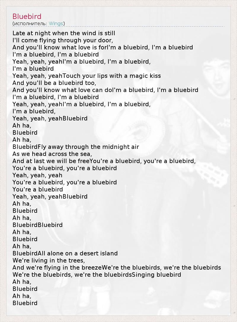 Late at night when the wind is still I'll come flying through your door, And you'll know what love is forI'm a bluebird, I'm a bluebird I'm a bluebird, I'm a bluebird Yeah, yeah, yeahI'm a bluebird, I'm a bluebird, I'm a bluebird Yeah, yeah, yeahTouch your lips with a magic kiss And you'll be a bluebird too, And you'll know what love can doI'm a bluebird, I'm a bluebird I'm a bluebird, I'm a bluebird Yeah, yeah, yeahI'm a bluebird, I'm a bluebird, I'm a bluebird, Yeah, yeah, yeahBluebird Ah ha, Bluebird Ah ha, BluebirdFly away through the midnight air As we head across the sea, And at last we will be freeYou're a bluebird, you're a bluebird, You're a bluebird, you're a bluebird Yeah, yeah, yeah You're a bluebird, you're a bluebird You're a bluebird Yeah, yeah, yeahBluebird Ah ha, Bluebird Ah ha, BluebirdBluebird Ah ha, Bluebird Ah ha, BluebirdAll alone on a desert island We're living in the trees, And we're flying in the breezeWe're the bluebirds, we're the bluebirds We're the bluebirds, we're the bluebirdsSinging bluebird Ah ha, Bluebird Ah ha, Bluebird
