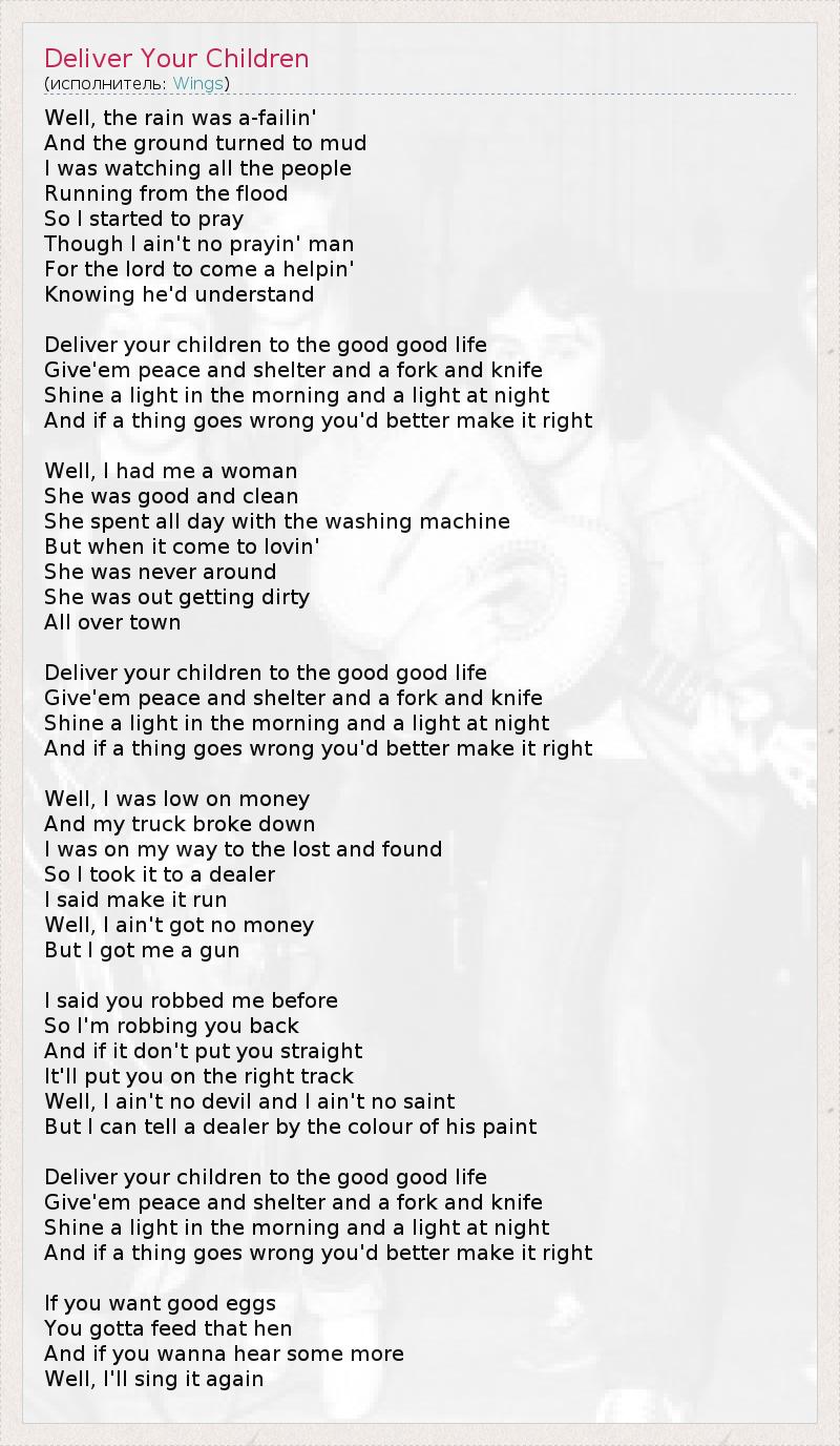 Well, the rain was a-failin' And the ground turned to mud I was watching all the people Running from the flood So I started to pray Though I ain't no prayin' man For the lord to come a helpin' Knowing he'd understand Deliver your children to the good good life Give'em peace and shelter and a fork and knife Shine a light in the morning and a light at night And if a thing goes wrong you'd better make it right Well, I had me a woman She was good and clean She spent all day with the washing machine But when it come to lovin' She was never around She was out getting dirty All over town Deliver your children to the good good life Give'em peace and shelter and a fork and knife Shine a light in the morning and a light at night And if a thing goes wrong you'd better make it right Well, I was low on money And my truck broke down I was on my way to the lost and found So I took it to a dealer I said make it run Well, I ain't got no money But I got me a gun I said you robbed me before So I'm robbing you back And if it don't put you straight It'll put you on the right track Well, I ain't no devil and I ain't no saint But I can tell a dealer by the colour of his paint Deliver your children to the good good life Give'em peace and shelter and a fork and knife Shine a light in the morning and a light at night And if a thing goes wrong you'd better make it right If you want good eggs You gotta feed that hen And if you wanna hear some more Well, I'll sing it again
