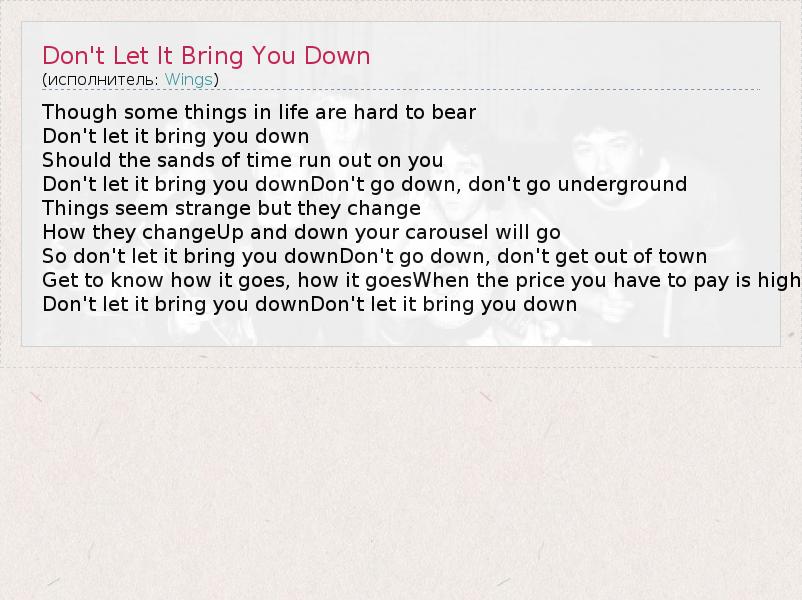 Though some things in life are hard to bear Don't let it bring you down Should the sands of time run out on you Don't let it bring you downDon't go down, don't go underground Things seem strange but they change How they changeUp and down your carousel will go So don't let it bring you downDon't go down, don't get out of town Get to know how it goes, how it goesWhen the price you have to pay is high Don't let it bring you downDon't let it bring you down
