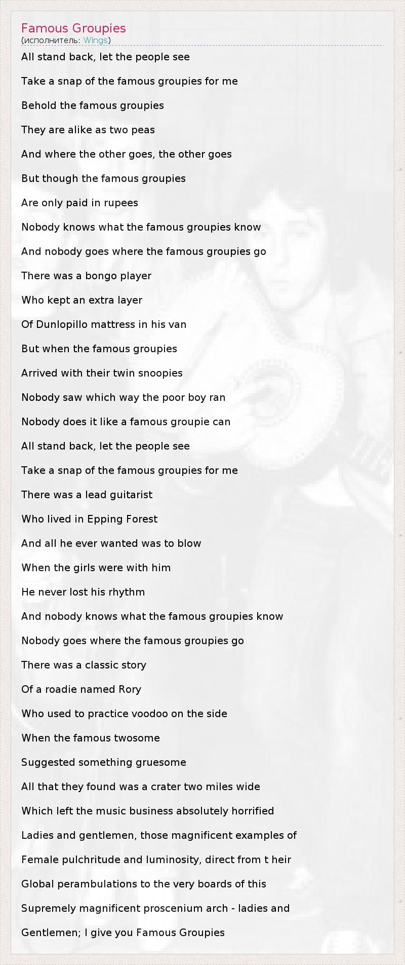 All stand back, let the people see Take a snap of the famous groupies for me Behold the famous groupies They are alike as two peas And where the other goes, the other goes But though the famous groupies Are only paid in rupees Nobody knows what the famous groupies know And nobody goes where the famous groupies go There was a bongo player Who kept an extra layer Of Dunlopillo mattress in his van But when the famous groupies Arrived with their twin snoopies Nobody saw which way the poor boy ran Nobody does it like a famous groupie can All stand back, let the people see Take a snap of the famous groupies for me There was a lead guitarist Who lived in Epping Forest And all he ever wanted was to blow When the girls were with him He never lost his rhythm And nobody knows what the famous groupies know Nobody goes where the famous groupies go There was a classic story Of a roadie named Rory Who used to practice voodoo on the side When the famous twosome Suggested something gruesome All that they found was a crater two miles wide Which left the music business absolutely horrified Ladies and gentlemen, those magnificent examples of Female pulchritude and luminosity, direct from t heir Global perambulations to the very boards of this Supremely magnificent proscenium arch - ladies and Gentlemen; I give you Famous Groupies