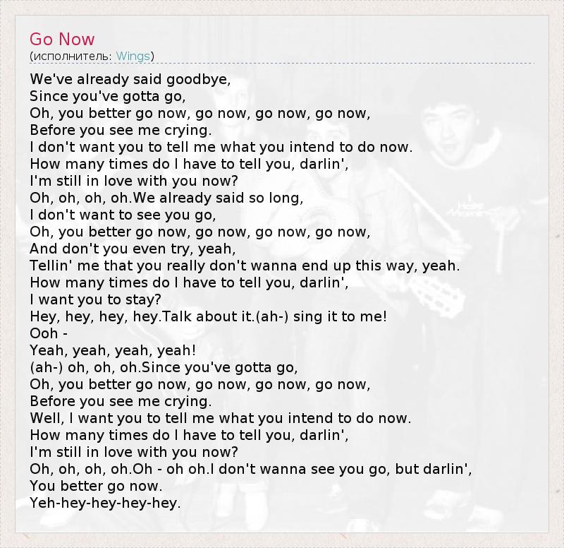 We've already said goodbye, Since you've gotta go, Oh, you better go now, go now, go now, go now, Before you see me crying. I don't want you to tell me what you intend to do now. How many times do I have to tell you, darlin', I'm still in love with you now? Oh, oh, oh, oh.We already said so long, I don't want to see you go, Oh, you better go now, go now, go now, go now, And don't you even try, yeah, Tellin' me that you really don't wanna end up this way, yeah. How many times do I have to tell you, darlin', I want you to stay? Hey, hey, hey, hey.Talk about it.(ah-) sing it to me! Ooh - Yeah, yeah, yeah, yeah! (ah-) oh, oh, oh.Since you've gotta go, Oh, you better go now, go now, go now, go now, Before you see me crying. Well, I want you to tell me what you intend to do now. How many times do I have to tell you, darlin', I'm still in love with you now? Oh, oh, oh, oh.Oh - oh oh.I don't wanna see you go, but darlin', You better go now. Yeh-hey-hey-hey-hey.
