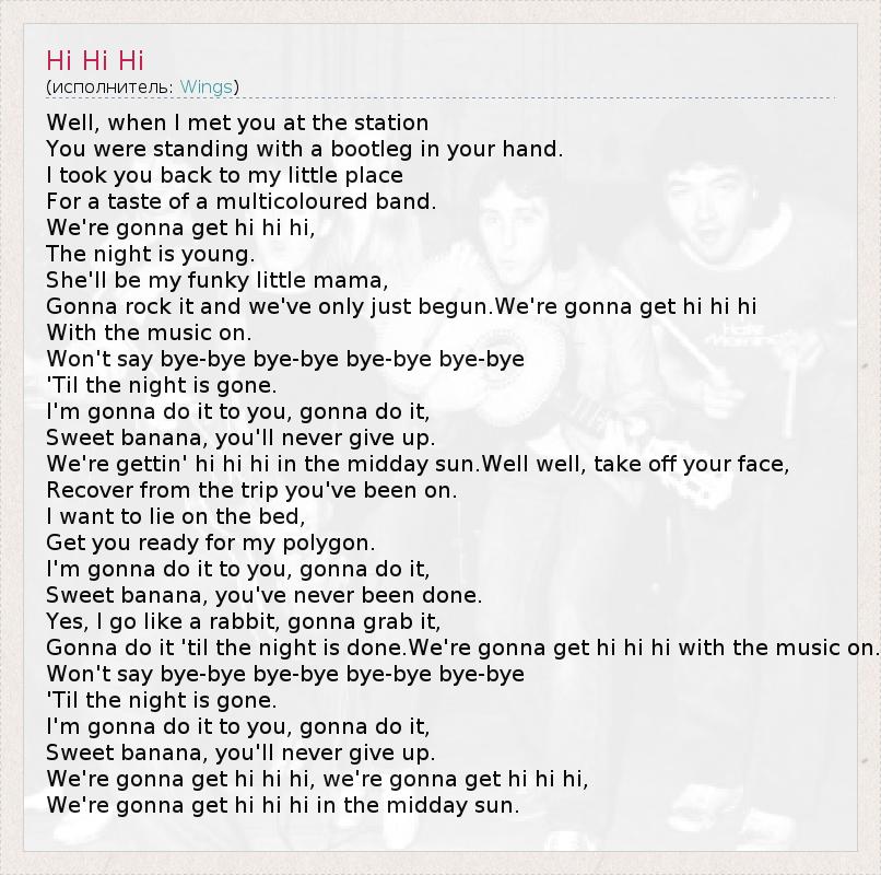 Well, when I met you at the station You were standing with a bootleg in your hand. I took you back to my little place For a taste of a multicoloured band. We're gonna get hi hi hi, The night is young. She'll be my funky little mama, Gonna rock it and we've only just begun.We're gonna get hi hi hi With the music on. Won't say bye-bye bye-bye bye-bye bye-bye 'Til the night is gone. I'm gonna do it to you, gonna do it, Sweet banana, you'll never give up. We're gettin' hi hi hi in the midday sun.Well well, take off your face, Recover from the trip you've been on. I want to lie on the bed, Get you ready for my polygon. I'm gonna do it to you, gonna do it, Sweet banana, you've never been done. Yes, I go like a rabbit, gonna grab it, Gonna do it 'til the night is done.We're gonna get hi hi hi with the music on. Won't say bye-bye bye-bye bye-bye bye-bye 'Til the night is gone. I'm gonna do it to you, gonna do it, Sweet banana, you'll never give up. We're gonna get hi hi hi, we're gonna get hi hi hi, We're gonna get hi hi hi in the midday sun.