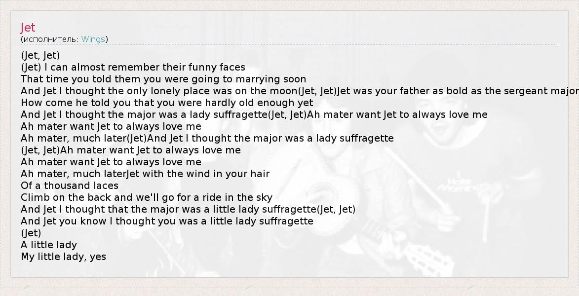 (Jet, Jet) (Jet) I can almost remember their funny faces That time you told them you were going to marrying soon And Jet I thought the only lonely place was on the moon(Jet, Jet)Jet was your father as bold as the sergeant major How come he told you that you were hardly old enough yet And Jet I thought the major was a lady suffragette(Jet, Jet)Ah mater want Jet to always love me Ah mater want Jet to always love me Ah mater, much later(Jet)And Jet I thought the major was a lady suffragette (Jet, Jet)Ah mater want Jet to always love me Ah mater want Jet to always love me Ah mater, much laterJet with the wind in your hair Of a thousand laces Climb on the back and we'll go for a ride in the sky And Jet I thought that the major was a little lady suffragette(Jet, Jet) And Jet you know I thought you was a little lady suffragette (Jet) A little lady My little lady, yes