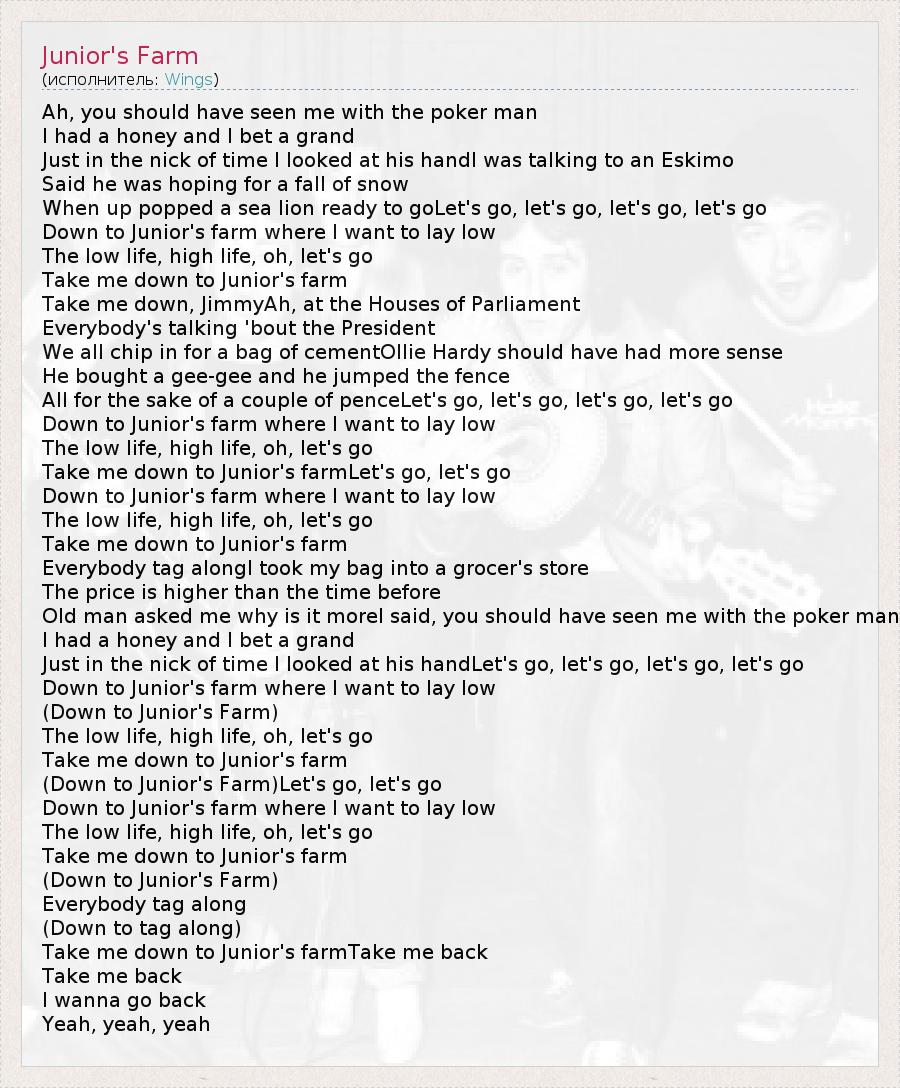 Ah, you should have seen me with the poker man I had a honey and I bet a grand Just in the nick of time I looked at his handI was talking to an Eskimo Said he was hoping for a fall of snow When up popped a sea lion ready to goLet's go, let's go, let's go, let's go Down to Junior's farm where I want to lay low The low life, high life, oh, let's go Take me down to Junior's farm Take me down, JimmyAh, at the Houses of Parliament Everybody's talking 'bout the President We all chip in for a bag of cementOllie Hardy should have had more sense He bought a gee-gee and he jumped the fence All for the sake of a couple of penceLet's go, let's go, let's go, let's go Down to Junior's farm where I want to lay low The low life, high life, oh, let's go Take me down to Junior's farmLet's go, let's go Down to Junior's farm where I want to lay low The low life, high life, oh, let's go Take me down to Junior's farm Everybody tag alongI took my bag into a grocer's store The price is higher than the time before Old man asked me why is it moreI said, you should have seen me with the poker man I had a honey and I bet a grand Just in the nick of time I looked at his handLet's go, let's go, let's go, let's go Down to Junior's farm where I want to lay low (Down to Junior's Farm) The low life, high life, oh, let's go Take me down to Junior's farm (Down to Junior's Farm)Let's go, let's go Down to Junior's farm where I want to lay low The low life, high life, oh, let's go Take me down to Junior's farm (Down to Junior's Farm) Everybody tag along (Down to tag along) Take me down to Junior's farmTake me back Take me back I wanna go back Yeah, yeah, yeah
